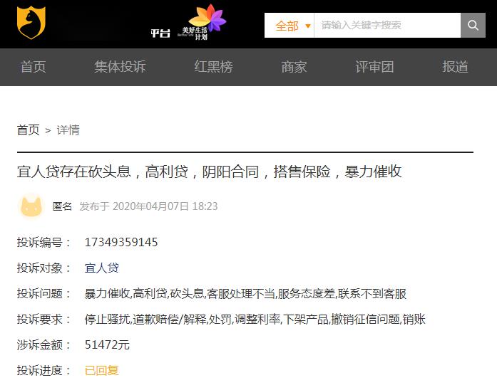 需要说明的是,在聚投诉、天猫投诉上,存在诸多用户对宜人贷的投诉。投诉内容多涉及砍头息、高利贷、阴阳合同、搭售保险、暴力催收等内容。