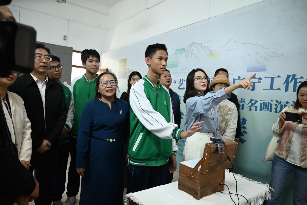 启动仪式上,工作室负责人、广东金融学院教授梁冰介绍了工作室未来发展规划,广州市白云区政协委员欧彩颜向广宁中学赠送了书画作品。启动仪式后,与会人员前往广宁中学格致楼一楼展览室,在梁冰教授的讲解下,参观了“画韵新生·AI元境”宋元明清名画沉浸式广宁校园展。随后,大家前往广宁县第六小学,现场观摩小学生竹编课程,并参观了小学生竹编作品展示。