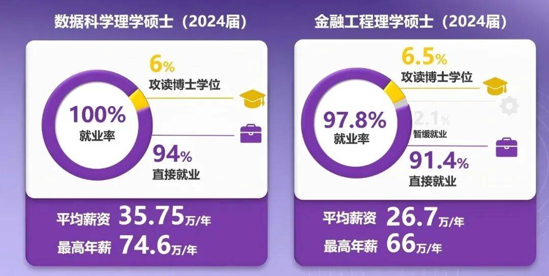 2024届数据科学就业率连续5年100%,薪资方面同样表现亮眼,年薪平均值达到 35.75 万元,中位数 36.8 万元。金融工程硕士毕业生的就业率(包括深造)保持在97.8%的高水平,毕业生平均年薪达26.7万元,中位数为25万元,最高年薪达66万元。