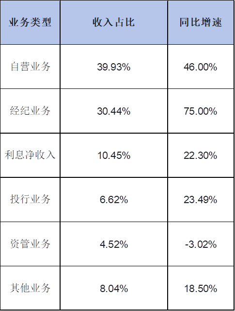 说明:自营业务稳居第一大收入来源,经纪业务受益于财富管理转型,同比增速大幅领先。