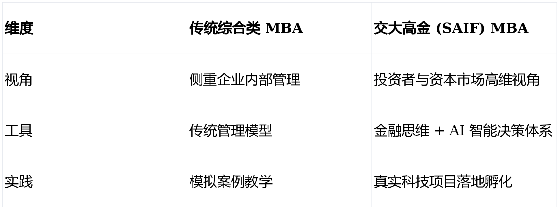 选择MBA时,管理者通常看四件事:课程结构、实践机制、校友与职业支持、区域产业资源。交大高金 MBA 的核心优势在于它解决了传统 MBA“懂管理、不懂资本、不懂 AI”的短板。